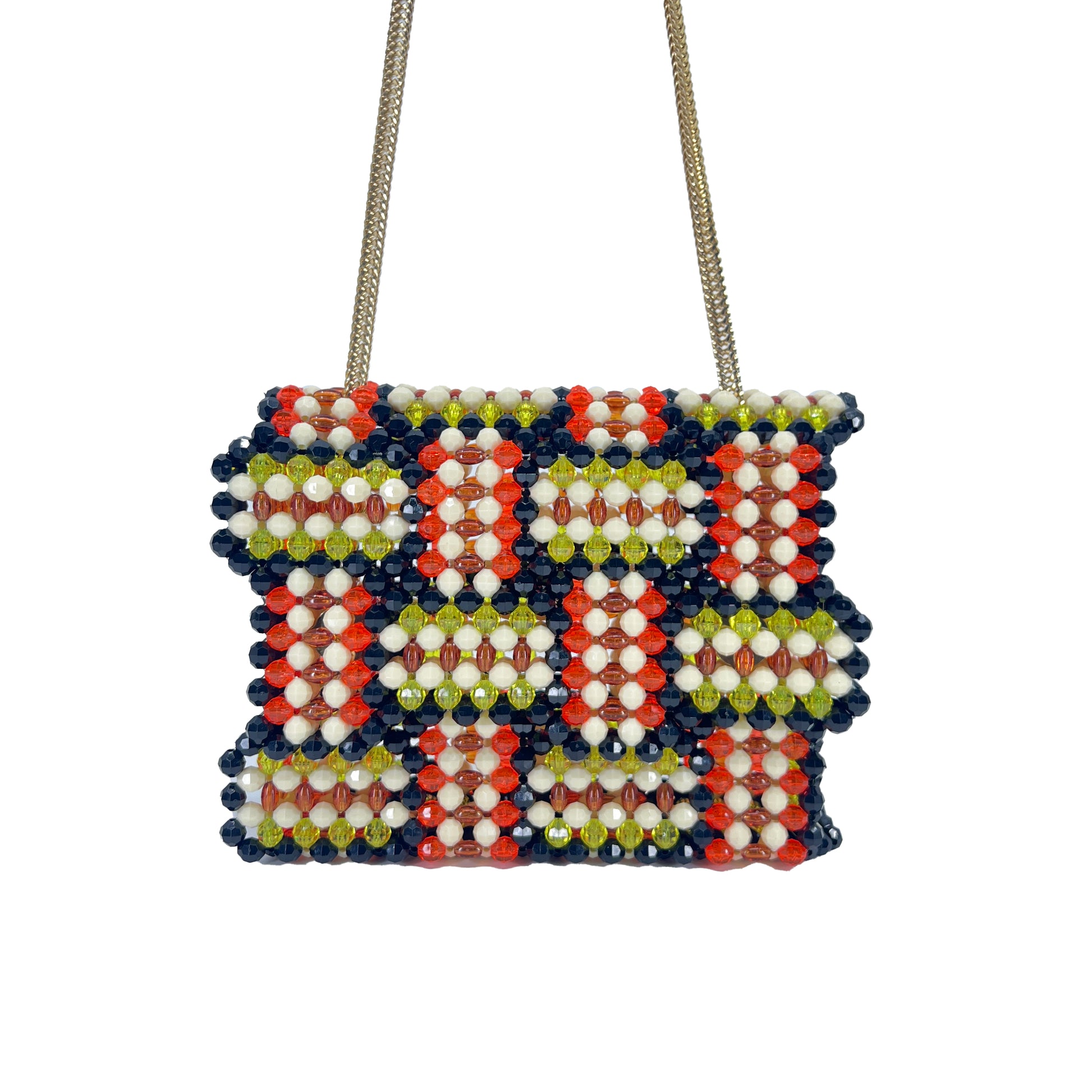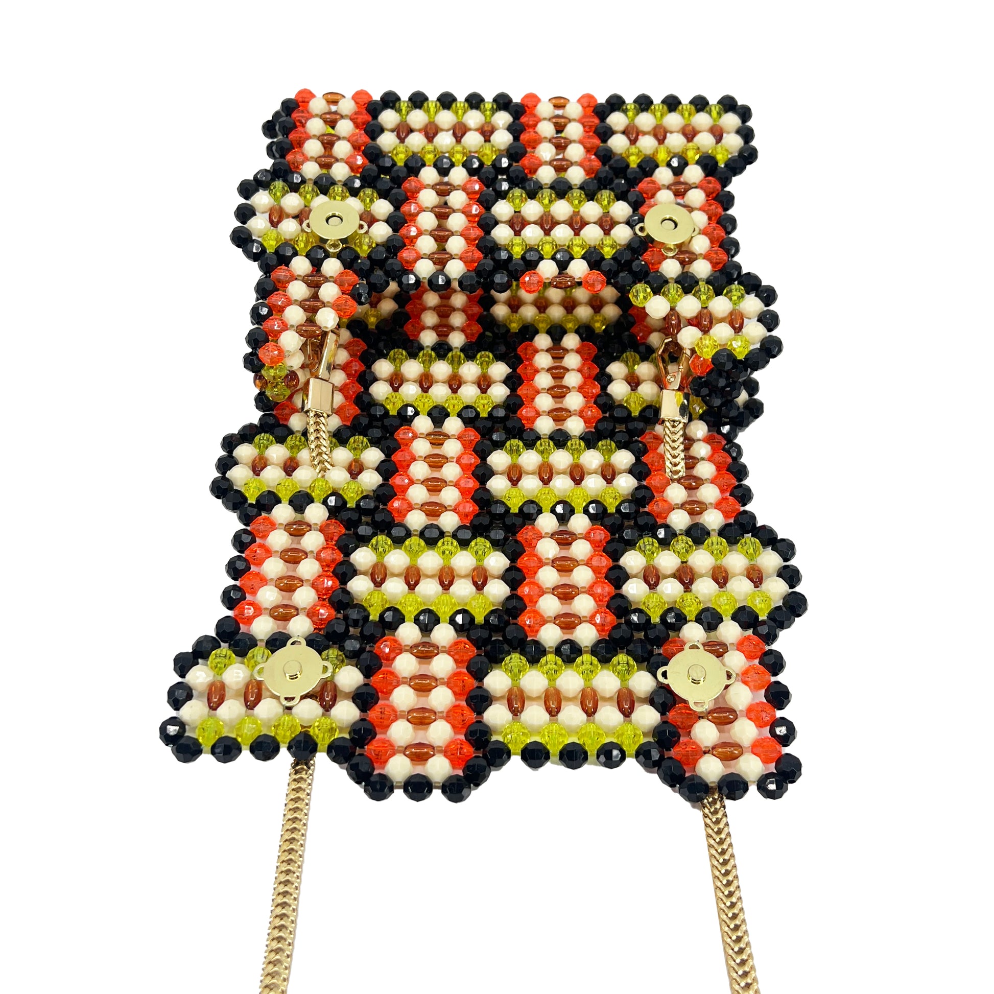 This Elegant handcrafted beaded bag is made with 8mm diamond-cut beads. It also has two magnetic closures for secure and convenient storage and comes with a metal chain that allows it to be worn as a shoulder or crossbody bag.