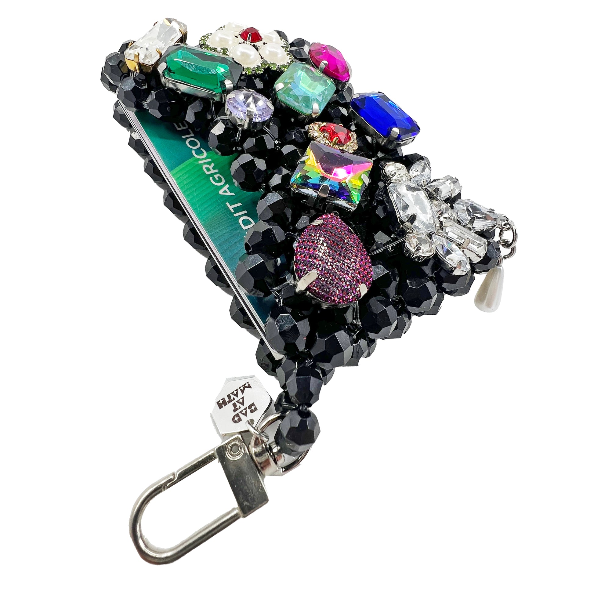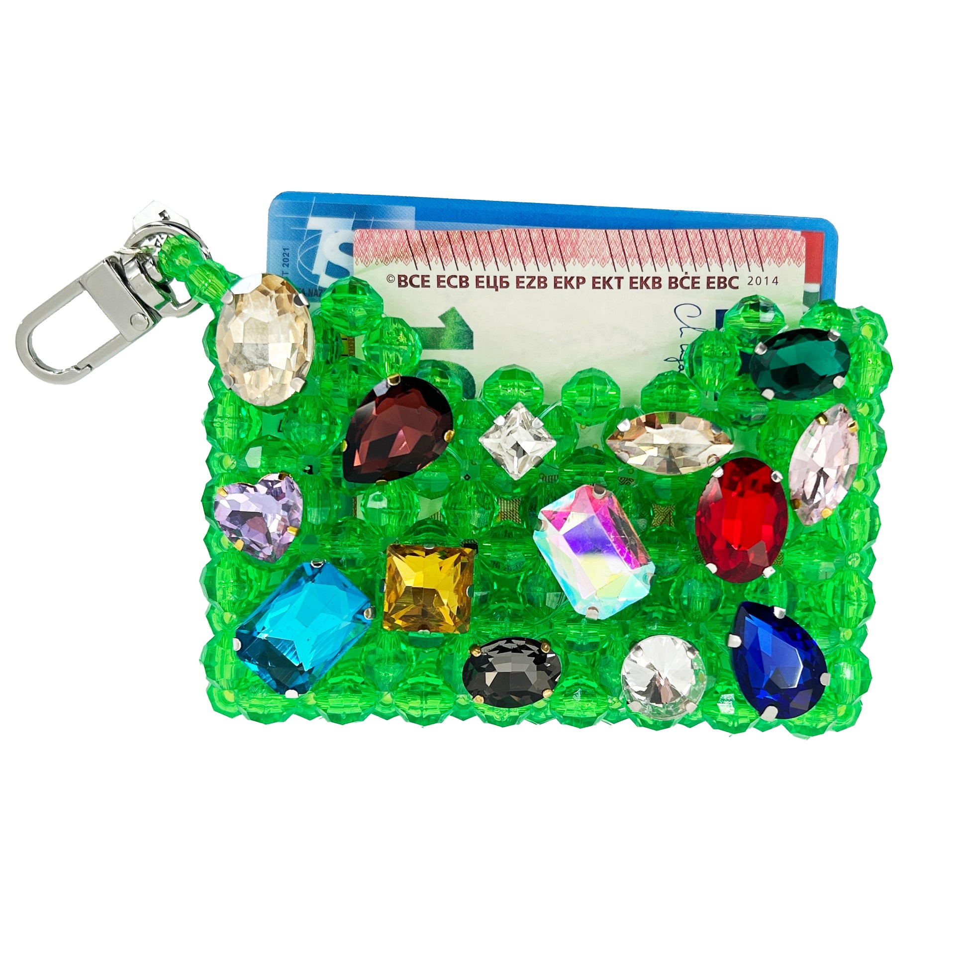 Handmade with Love and 8mm faceted Beads, It has Mixed Crystals sew on by hand one by one. It Fits Up to 5 cards and Cash and with his Silver Clasp it can be worn hanging in your Belt Loop <3